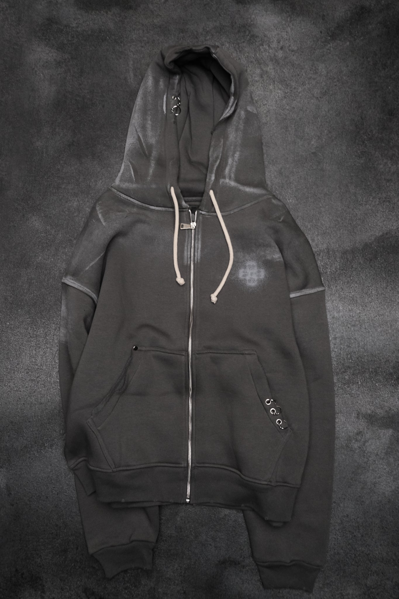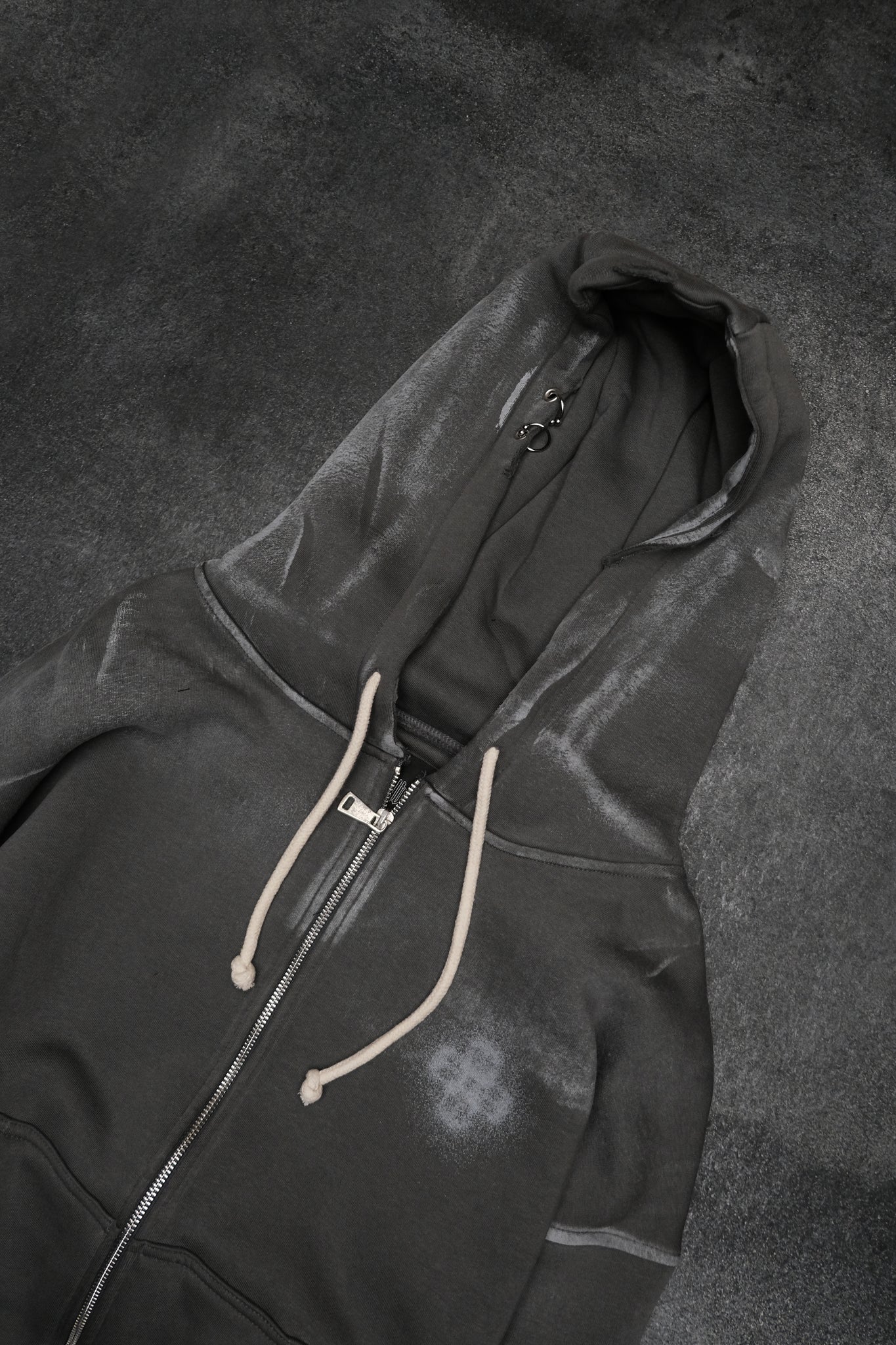 slightly oversized zip hoodie made from heavy cotton with a washed grey finish. Features a full metal zipper, adjustable hood with drawstrings, ribbed cuffs and hem, and front pockets. Designed with a minimal front and a bold graphic print on the back, finished with subtle BALBUS details for a worn-in, industrial look.