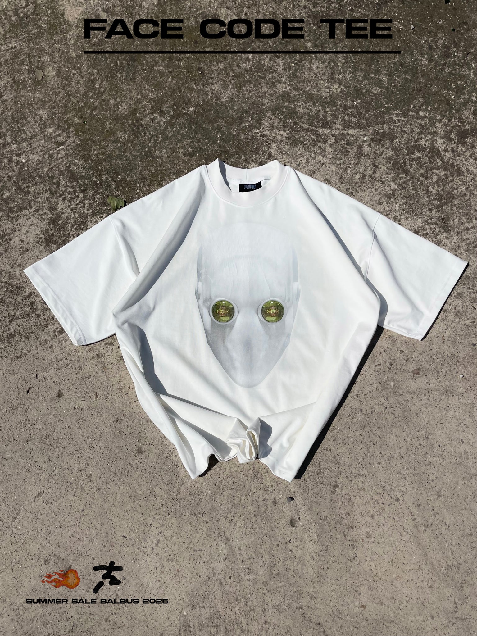 Digitally printed artwork on heavyweight cotton. Features a ghosted 3D face with dual-lens “balbus” eyes — a distorted gaze that locks in. Oversized fit, finished with a stitched red embroidered patch at the back hem.